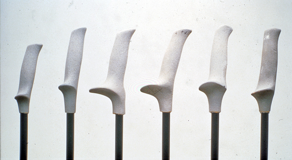 Sauvaputkien materiaaleissa ja sompien muotoilussa kehitystä tapahtui koko ajan, mutta sauvojen kahvat säilyivät hyvin samantyyppisinä vuosikymmenet. Eräs epäonnistunut muotoiluyritys oli rakentaa suksisauvaan lapion kahvan tyyppistä kädensijaa. Sillä sai kyllä liikkeeseen voimaa, mutta ongelmana oli, että sauvasta tuli vaikeasti hallittava ja se osui minne sattui. Vuonna 1987 Exel Oy antoi muotoilutoimisto Creadesign Oy:lle tehtäväksi suunnitella uudenlaisen kahvan. Vaatimuksena oli löytää ratkaisu, joka antaisi mahdollisimman hyvän tuen työnnön joka vaiheessa. Muotoilijat suunnittelivat useita malleja, joiden avulla selvitettiin eri kahvatyyppien vaikutusta työntövoimaan ja siihen, miten käsi pääsi niissä kääntymään. Tulosten perusteella voitiin valita jatkokehittelyyn siirtyvä perusmalli.