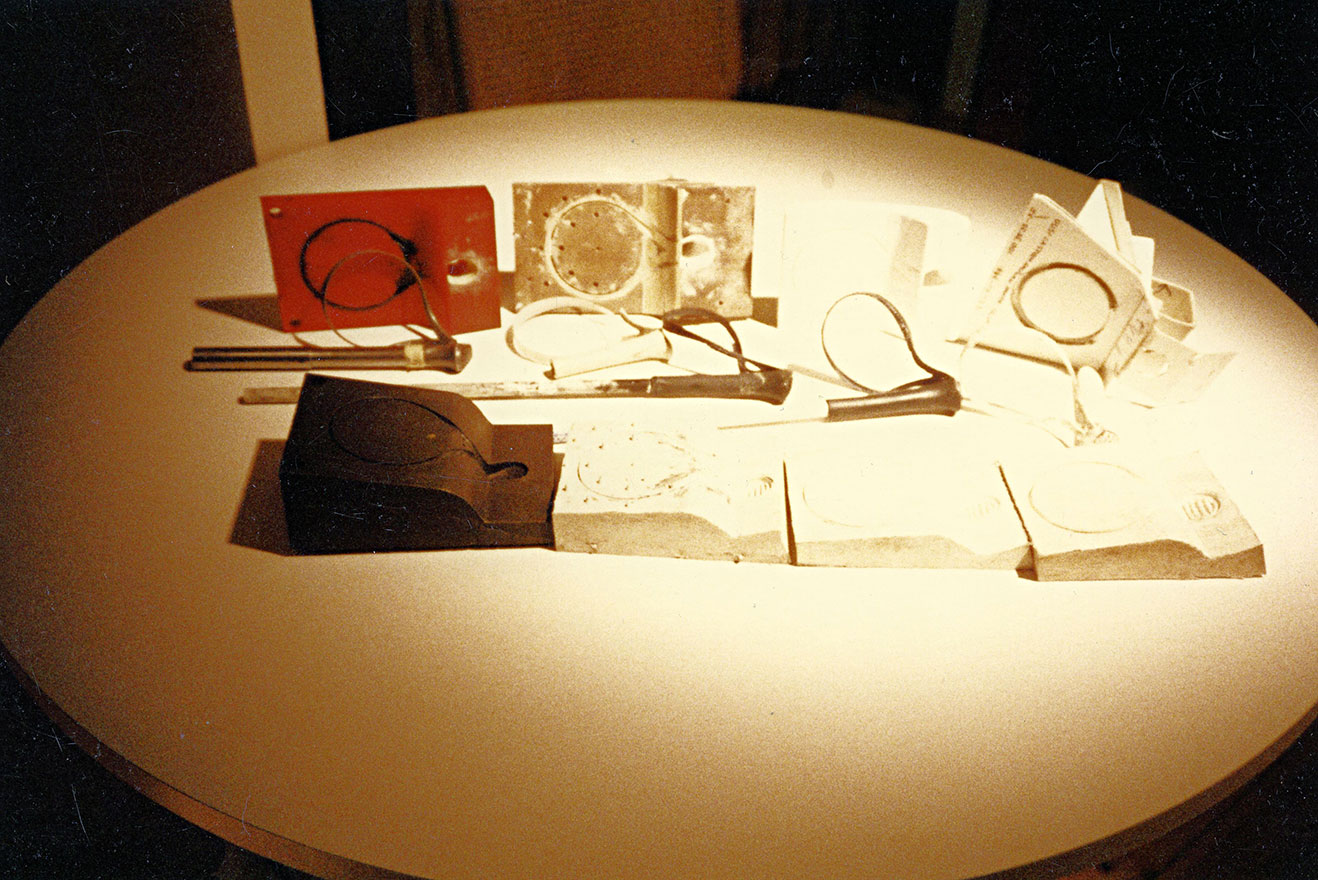 Leskisen Exelille suunnittelemat ja rakentamat kahvan kaiverrusmallit, jakopintaluonnokset ja muovi-teräs -jakopintojen kaiverrusmallit.