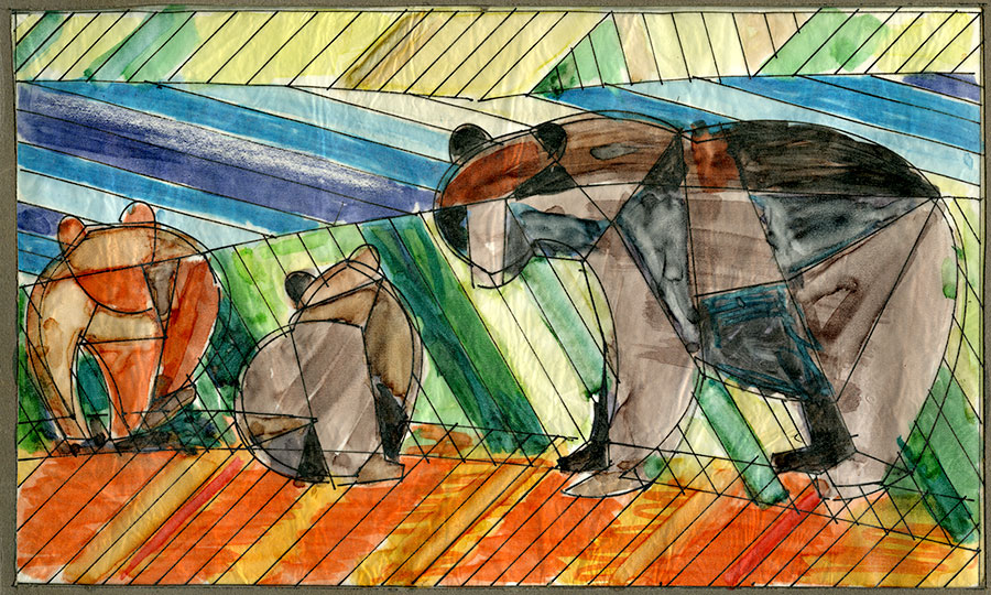 Risteilyalus Karelian lasireliefiseinän ”Kalastavat karhut” luonnospiirustus vuodelta 1977.