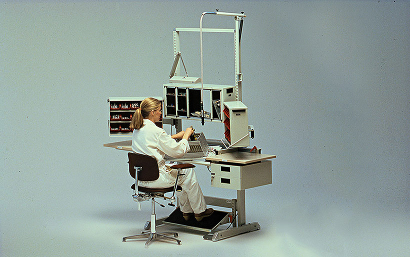 G. W. Sohlberg Oy:n teollisuuskalustetehtaassa Jyväskylässä tehtiin vuonna 1980 päätös kehittää uusi sähkö- ja elektroniikkateollisuuden lyhyisiin tuotantosarjoihin soveltuva ja ergonomialtaan ylivoimainen kalustejärjestelmä. Suunnittelussa Raimo Nikkanen kiinnitti erityistä huomiota ergonomiaan, mitoitukseen, työntekijäkohtaisiin säätöihin ja tuotekohtaisiin muuntelumahdollisuuksiin sekä tuotantotalouteen. Kuvassa elektroniikka- ja sähköteollisuuden kokoonpanoon suunniteltu tuotantoteline.