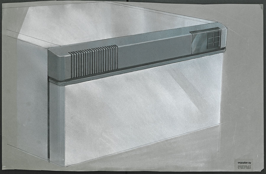 Sarjatuotteiden suunnittelussa muotoiluratkaisut ovat isoja tuotannollisia päätöksiä, ja niissä korostuu toiminnallisuuden lisäksi teollisen muotoilijan hintatietoisuuden merkitys. ”Kodinkoneita tehdään jopa kymmenien tuhansien kappaleiden sarjoissa, joten tekotapa on silloin tärkeä. Suurten sarjojen suunnittelussa pieneen yksityiskohtaan käytetty ylimääräinen työ ja aika saattavat lisätä kannattavuutta huomattavasti.” Kuvassa luonnos Helkama-jääkaapin yläosasta.