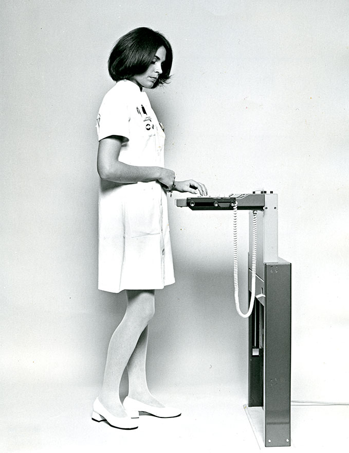 Maailman ensimmäinen mikroprosessoriohjattu digitaalinen röntgenlaitteen ohjauspöytä BR 1001. Tuotteen ovat muotoilleet Juhani Salovaara ja Heikki Kiiski.