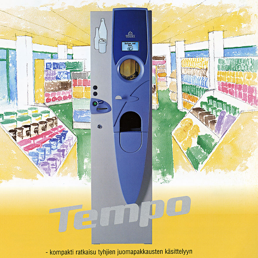 Modernisti muotoiltu Tomra Tempo on lasi- ja muovipullojen sekä tölkkien palautusautomaatti.