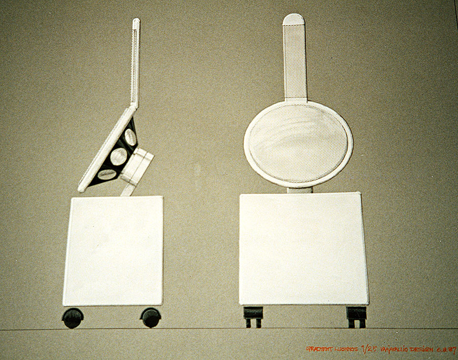 Vaajakallion vuonna 1987 piirtämä luonnos kaiuttimesta, joka ei päässyt tuotantoon.
