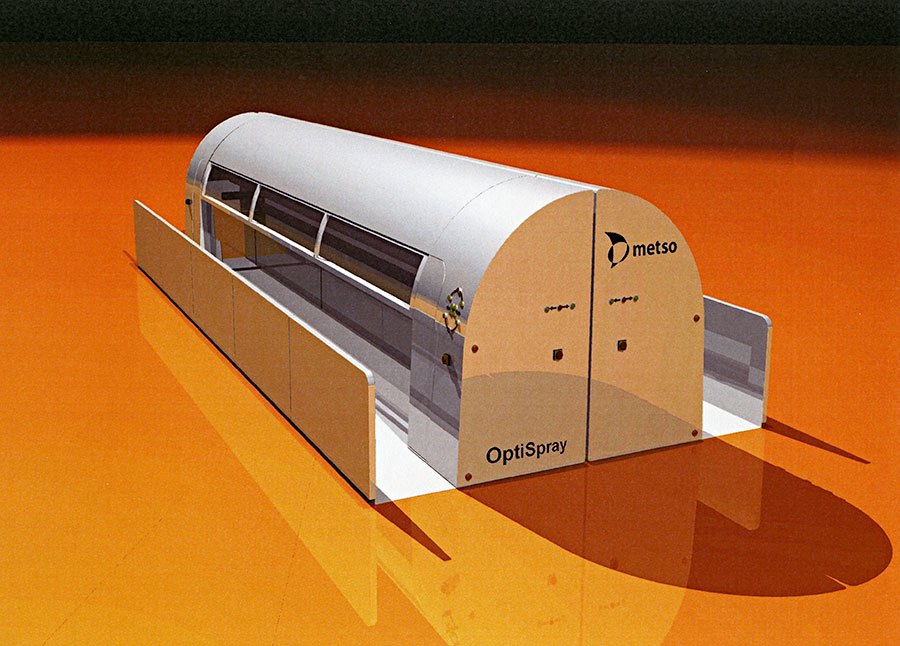 ”Jos ulkonäöllä ei ole väliä, miksi emme jättäisi esitteistä kuvia pois?”, kysyy Väätänen. Esimerkiksi Metson tuotteen pitää myös näyttää Metson tuotteelta - luotettavalta, tehokkaalta ja laadukkaalta. Kuvassa OptiSpray-päällystysasema.