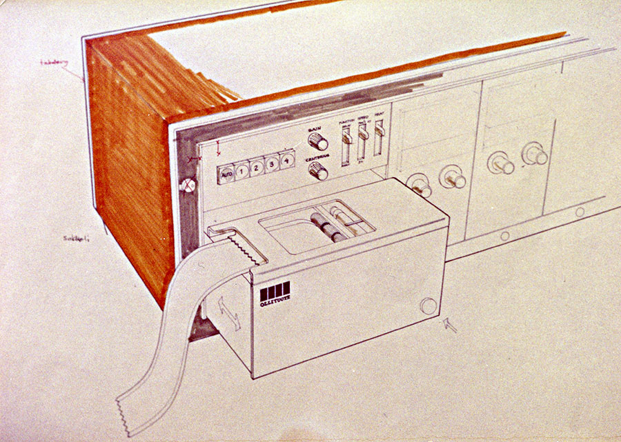 Laitteiden suunnittelu tapahtui ryhmätyönä, ja Wikström osallistui suunnitteluun heti alkuvaiheessa visualisoiden ryhmän ajatukset piirrosten ja mallikappaleiden muotoon. Kuvassa piirustus potilasvalvontalaitteesta.