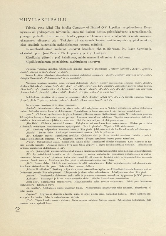 Huvilakilpailu 1932 The Insulite Company of Finland O.Y. julisti tyyppihuvilakilpailun vuonna 1932. Osallistujien piti suunnitella yhden perheen talvihuvila. Kilpailun voitti arkkitehti O. Flodin ehdotuksellaan ”Nono”. huvilakilpailu Kuva 20 / 34