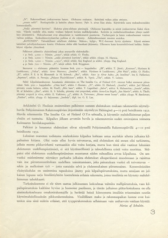 Huvilakilpailu 1932 The Insulite Company of Finland O.Y. julisti tyyppihuvilakilpailun vuonna 1932. Osallistujien piti suunnitella yhden perheen talvihuvila. Kilpailun voitti arkkitehti O. Flodin ehdotuksellaan ”Nono”. huvilakilpailu Kuva 21 / 34