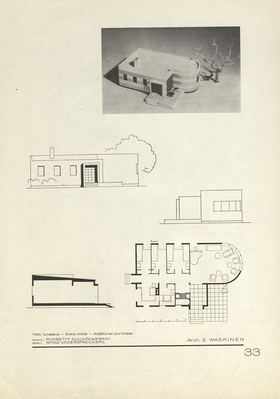 Huvilakilpailu 1932 The Insulite Company of Finland O.Y. julisti tyyppihuvilakilpailun vuonna 1932. Osallistujien piti suunnitella yhden perheen talvihuvila. Kilpailun voitti arkkitehti O. Flodin ehdotuksellaan ”Nono”. E. Waskinen Kuva 14 / 34