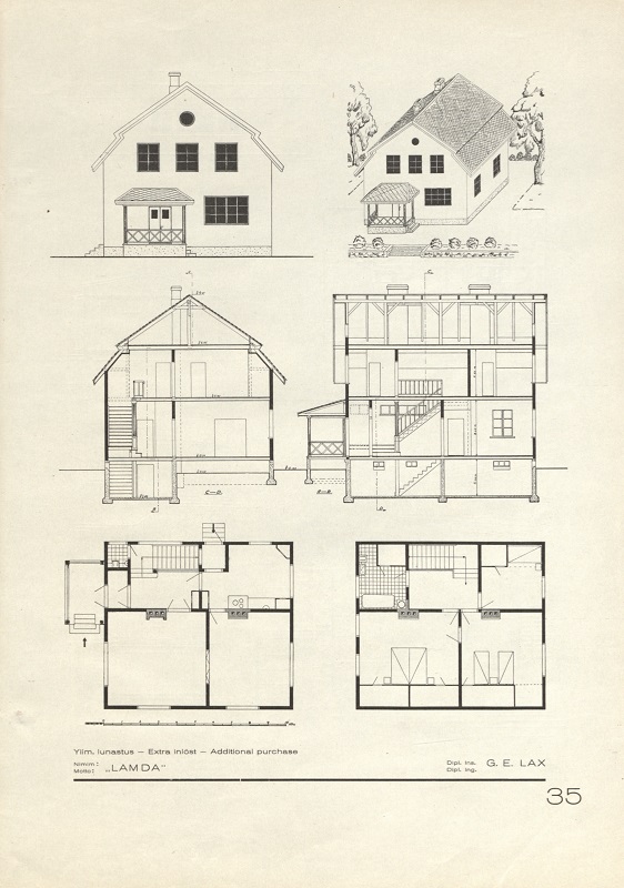 Huvilakilpailu 1932 The Insulite Company of Finland O.Y. julisti tyyppihuvilakilpailun vuonna 1932. Osallistujien piti suunnitella yhden perheen talvihuvila. Kilpailun voitti arkkitehti O. Flodin ehdotuksellaan ”Nono”. G. E. Lax Kuva 16 / 34