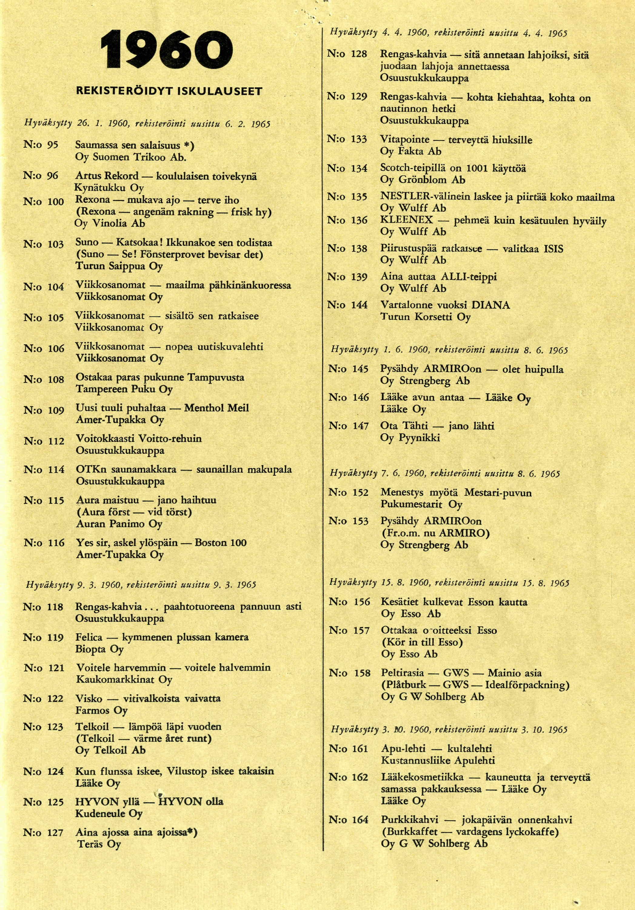 Anttilan arkistosta löytyi eripainos Mainosuutisista vuodelta 1966. Lehtisestä löytyy iskulauseita väliltä 1 – 553. Sarja ei ole täydellinen, vaan lauseita oli jo tuolloin poistettu rekisteristä.