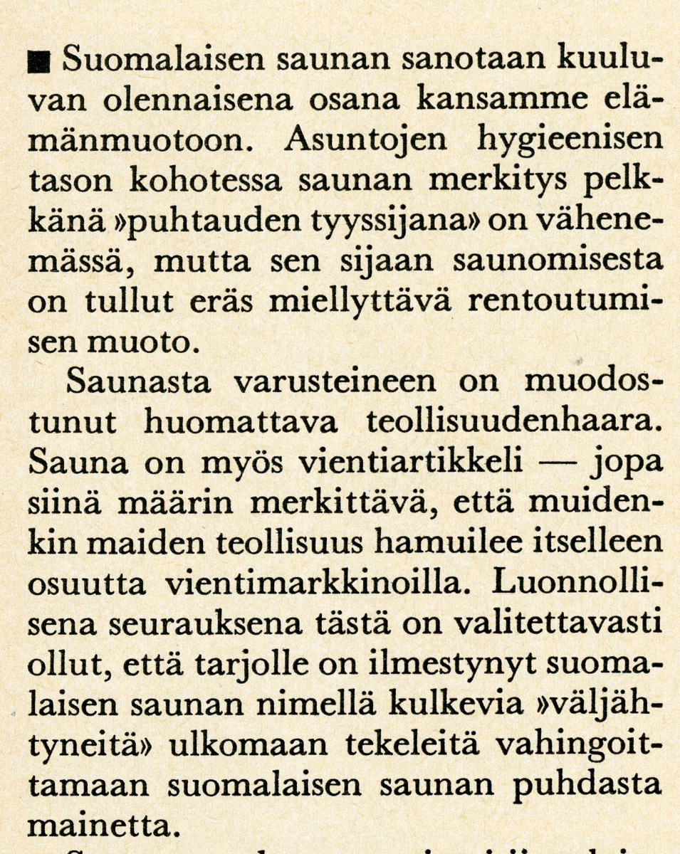 Gallerian lopuksi leike Enso-Gutzeitin henkilökuntalehden 1/70 artikkelista ”Laatua löylyyn”.