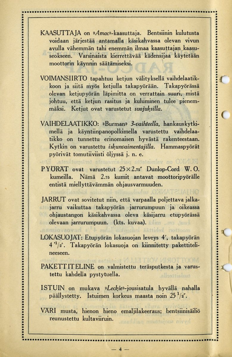 Radco-moottoripyörien esite vuodelta 1928 löytyi Keskusosuusliike Hankkijan arkistosta. Neli- ja kaksitahtisten moottoripyörien esite alla digitoituna. Esitteen mukaan pyörillä saattoi tavallisilla maanteillä ajaa noin viittäkymppiä ja bentsiiniä kului noin 1 litra/50 km. Lisää teknisiä tietoja esitteestä.