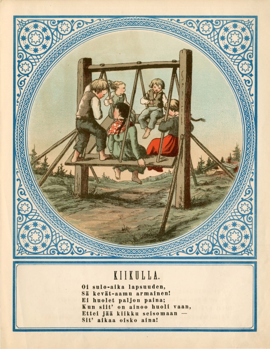 Suomen lasten elämää 1800-luvun lopulla kuvaa ”Kuvia Suomen lasten elämästä” -kirja. Se sisältää lasten puuhia kymmenen R. Åkerlundin piirroksen verran, eri vuodenajoilta. Kuvissa ollaan muun muassa marjassa, mäenlaskussa ja joulukirkkomatkalla.