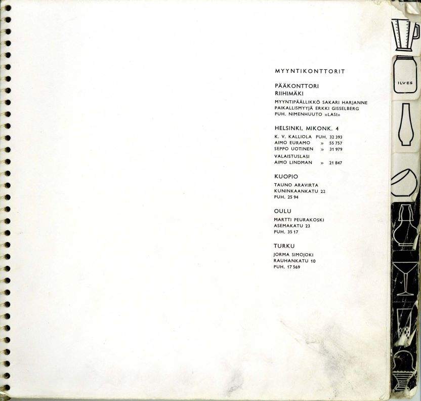 Kuvasto vuodelta 1954 sisältää puristettua talouslasia, säilöntäastioita ja viilikehloja, lampun- ja lyhdynlaseja, myymäläkalusteita, puhallettua talouslasia, astiastoja, hiottua lasia ja koristelasia. Kuvaston lasiesineiden suunnittelijoina on mm. Nanny Still ja Helena Tynell.