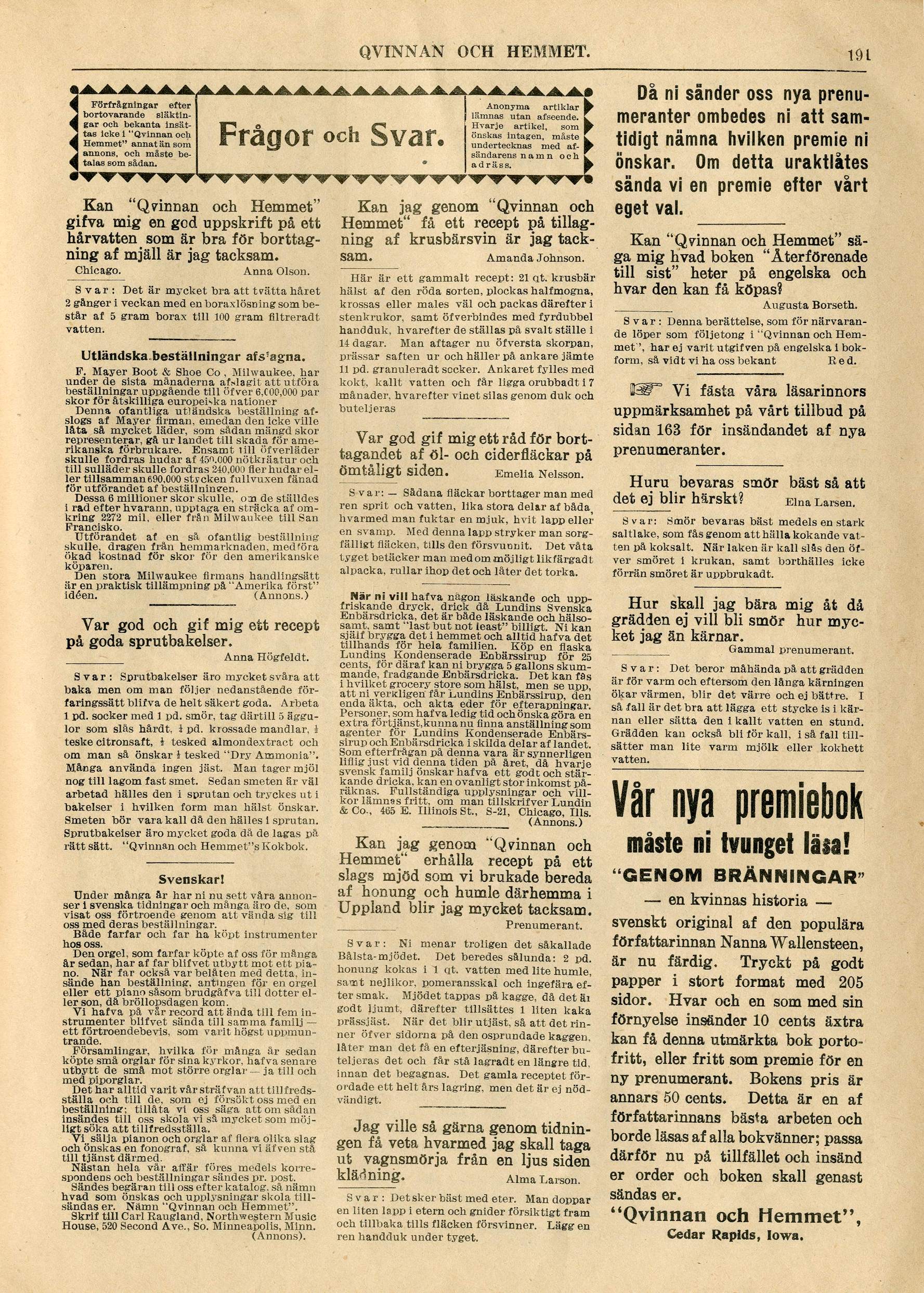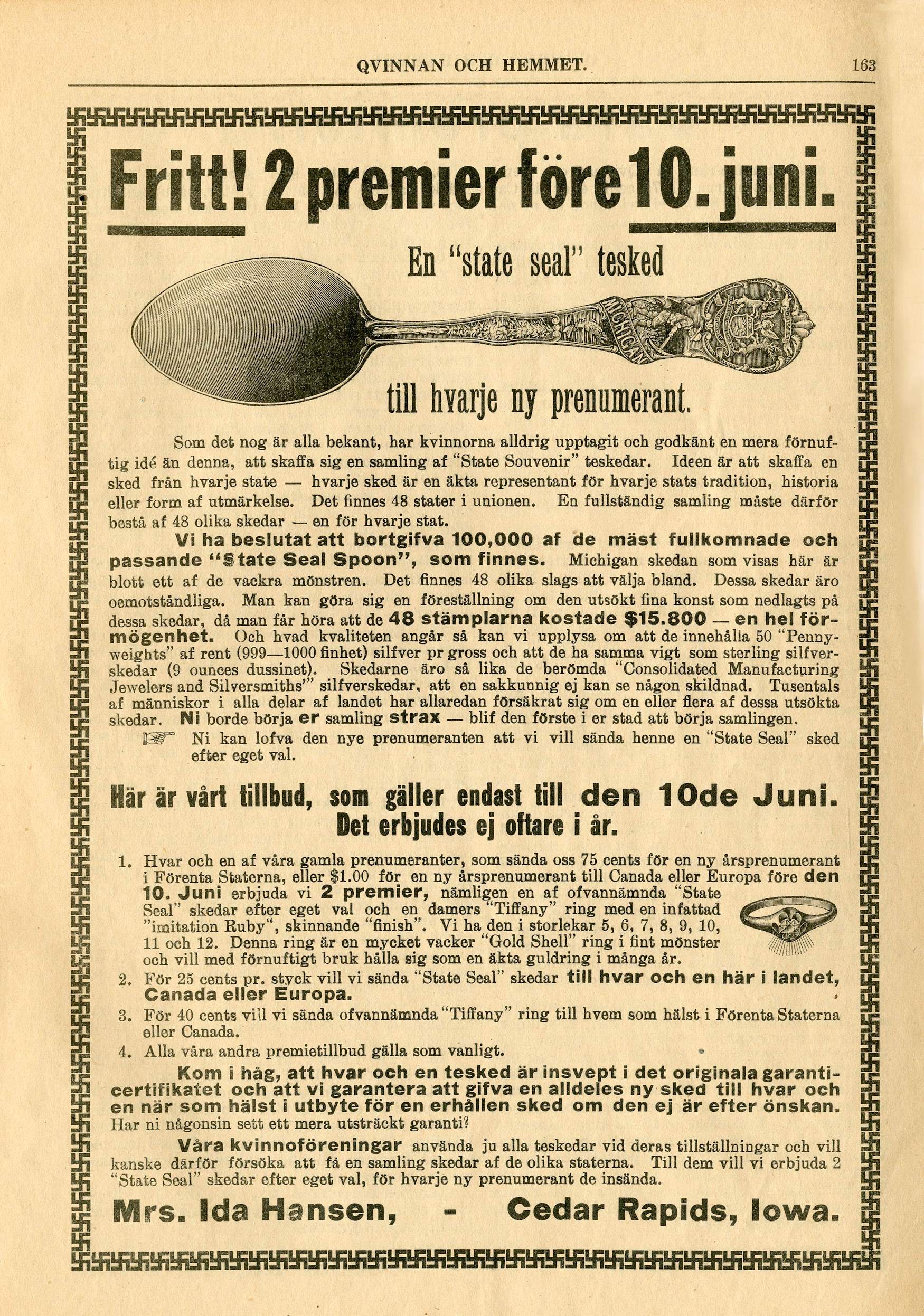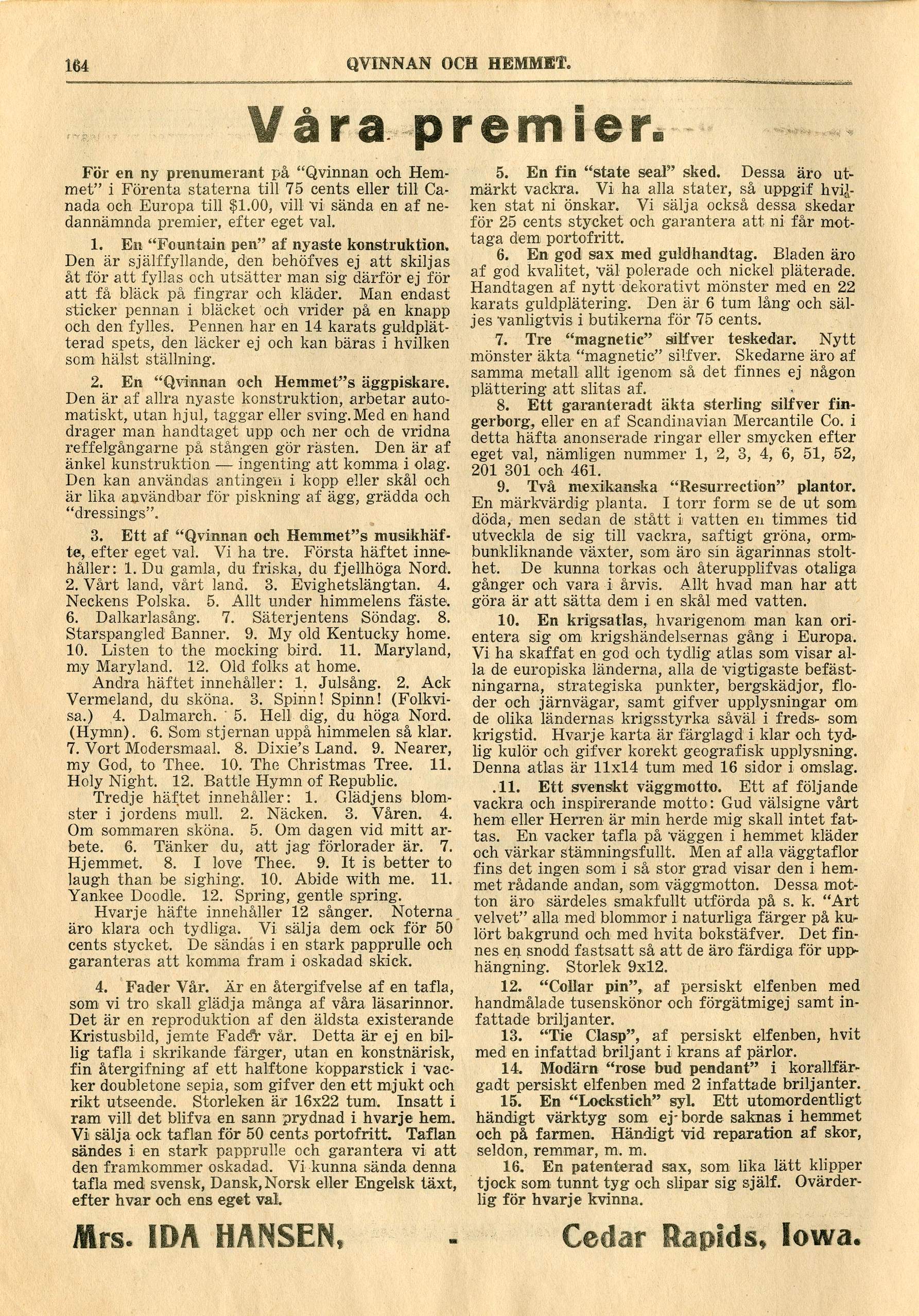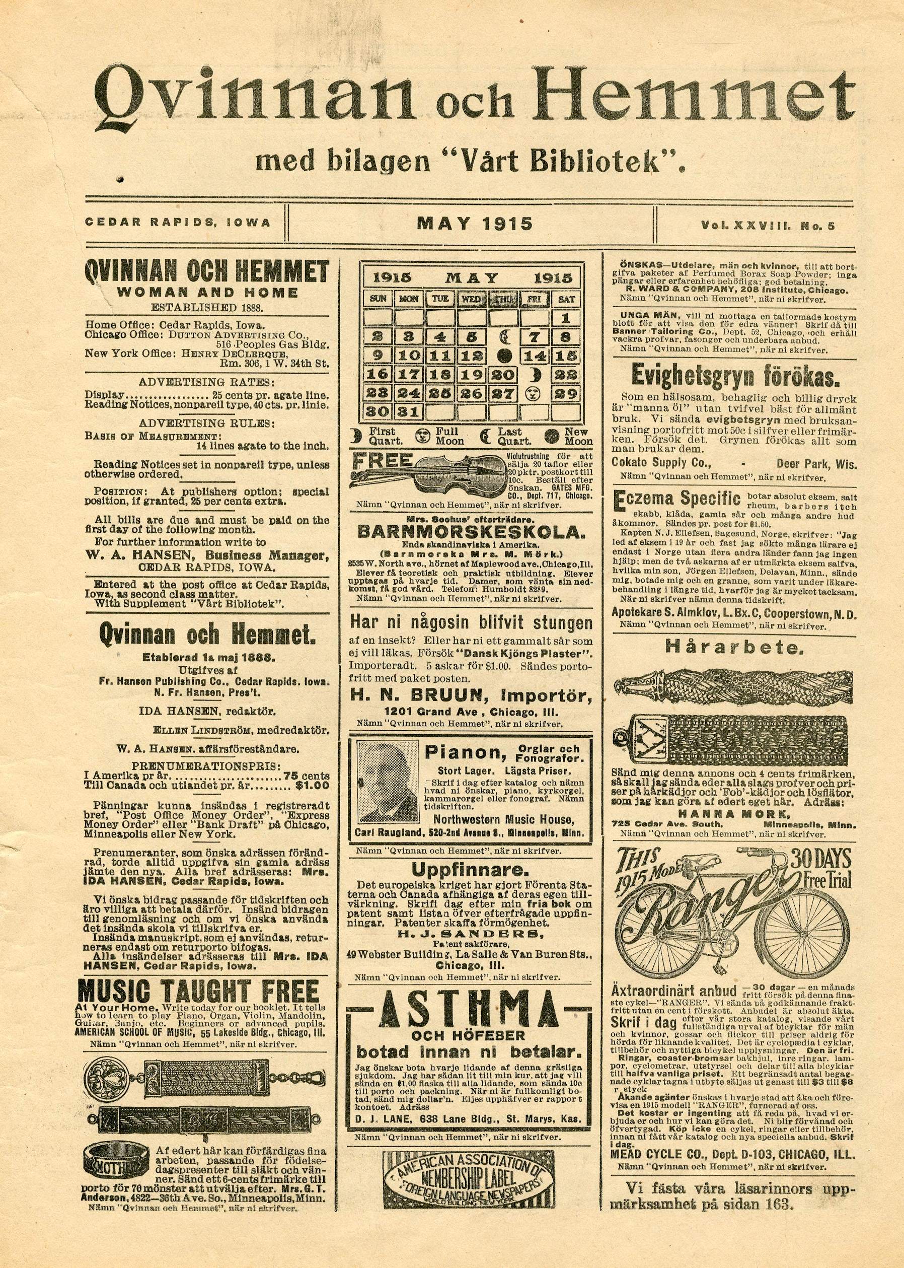Lehti on perustettu vuonna 1888 ja sen pääkonttorin sijainniksi kerrotaan Cedar Rapids, Iowa. Lehti on mitä ilmeisimmin tarkoitettu ruotsinkielisille siirtolaisille. Ruokaohjeita, mainoksia, muotia ja muuta luettavaa eli naistenlehtien perusaineistoa.