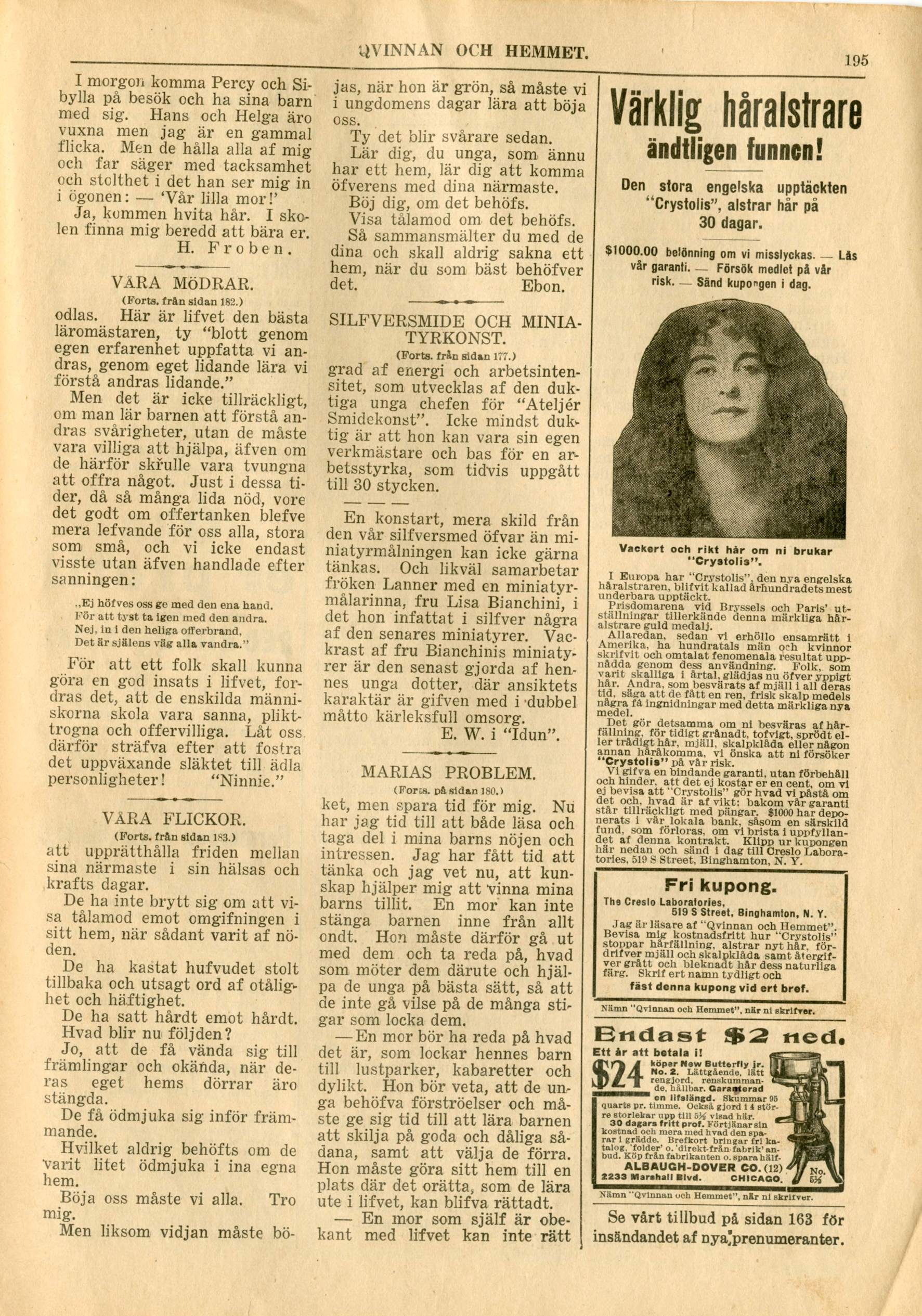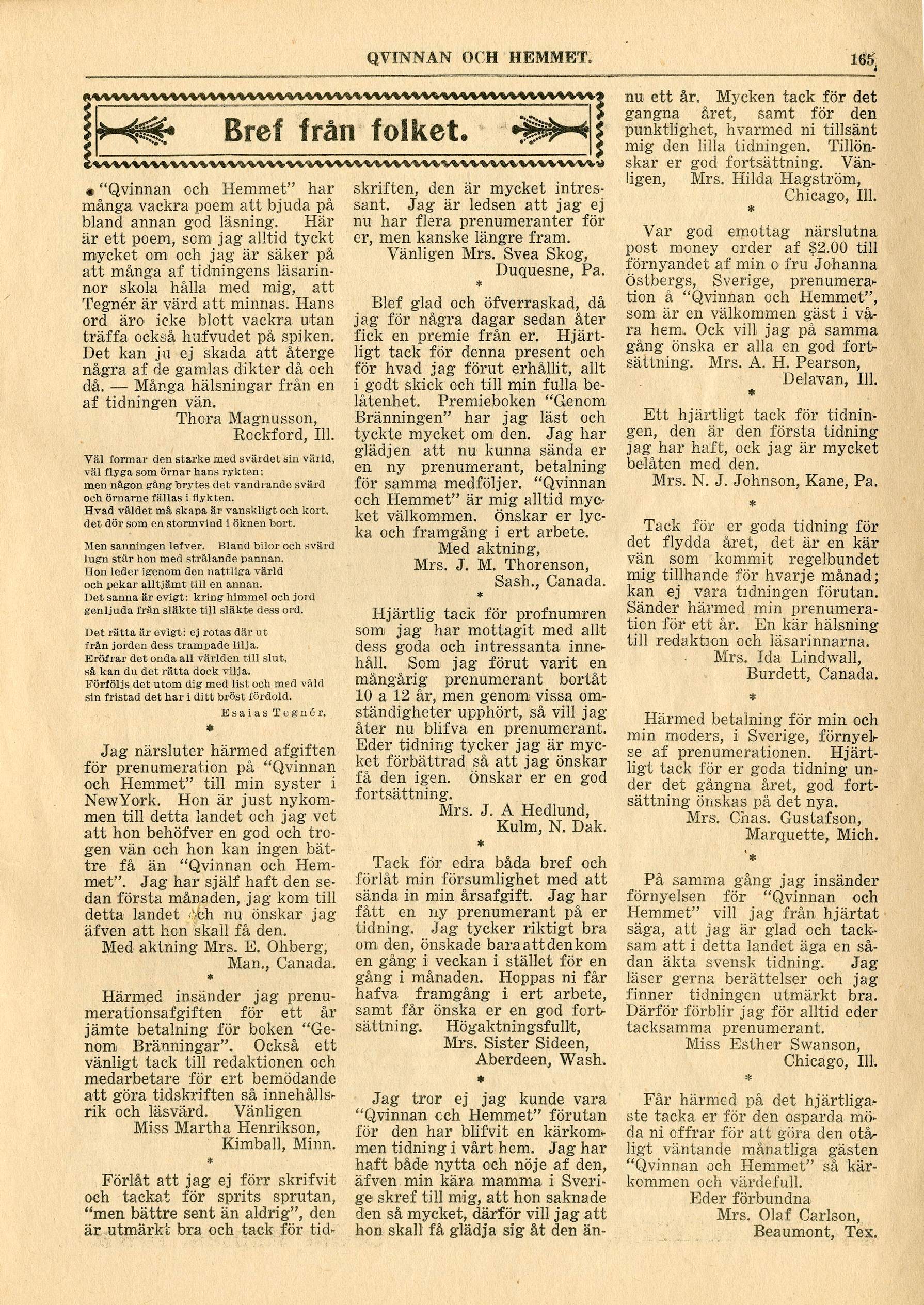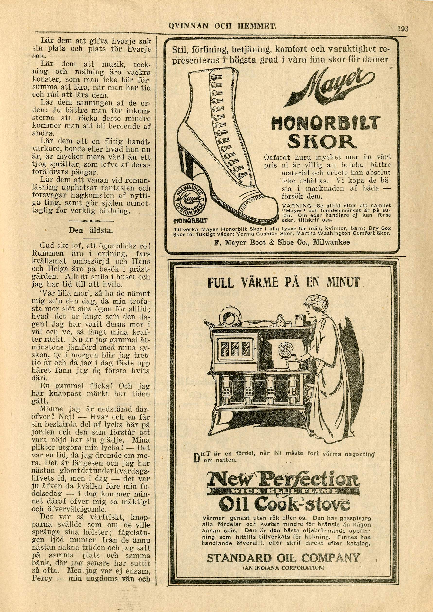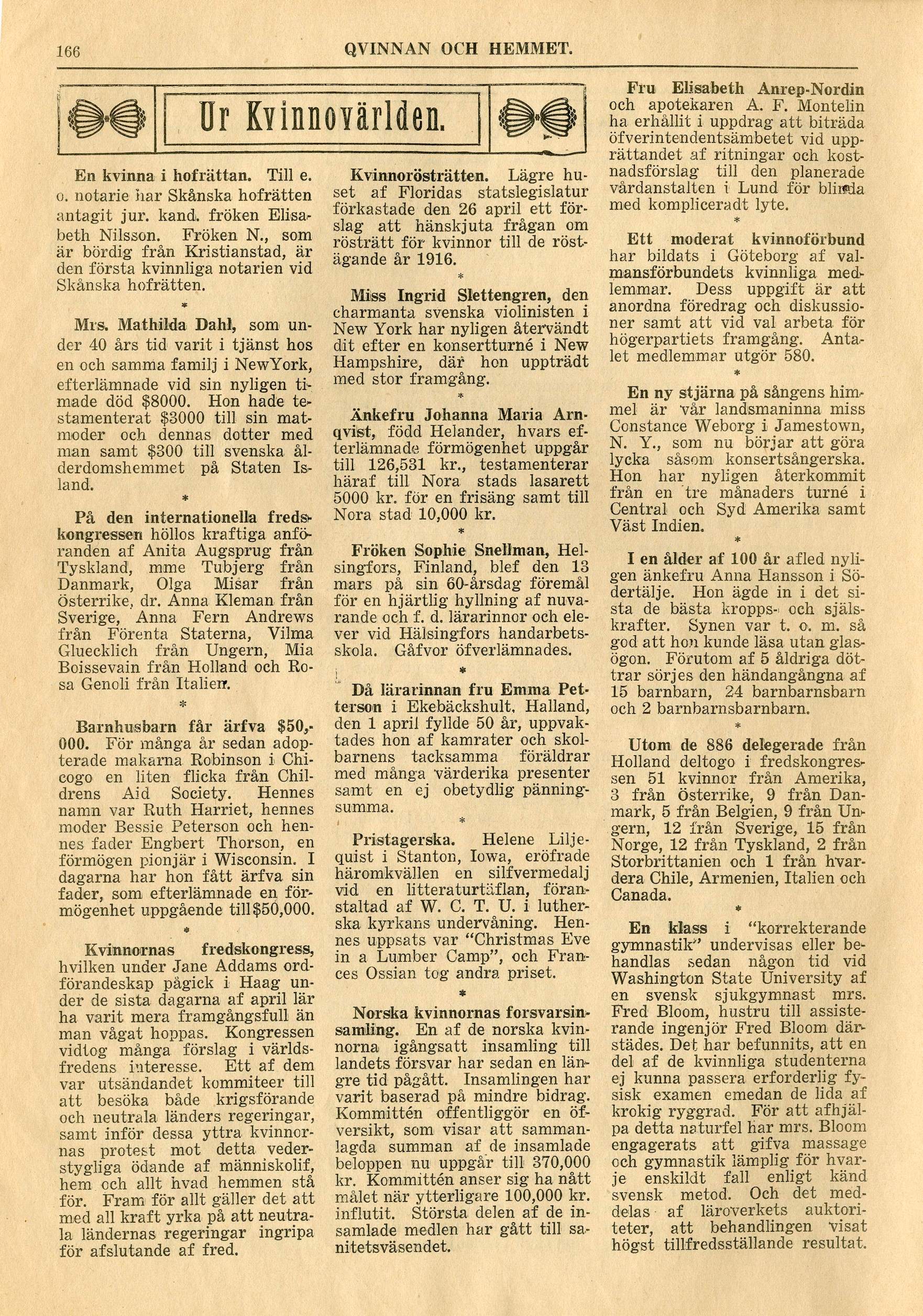 Lehti on perustettu vuonna 1888 ja sen pääkonttorin sijainniksi kerrotaan Cedar Rapids, Iowa. Lehti on mitä ilmeisimmin tarkoitettu ruotsinkielisille siirtolaisille. Ruokaohjeita, mainoksia, muotia ja muuta luettavaa eli naistenlehtien perusaineistoa.
